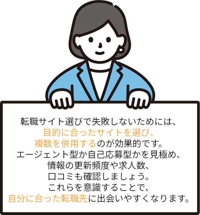 転職サイトごとに強みが異なるため、キャリアや目的に合ったサイトを選び、事前に比較することでミスマッチを防げます。